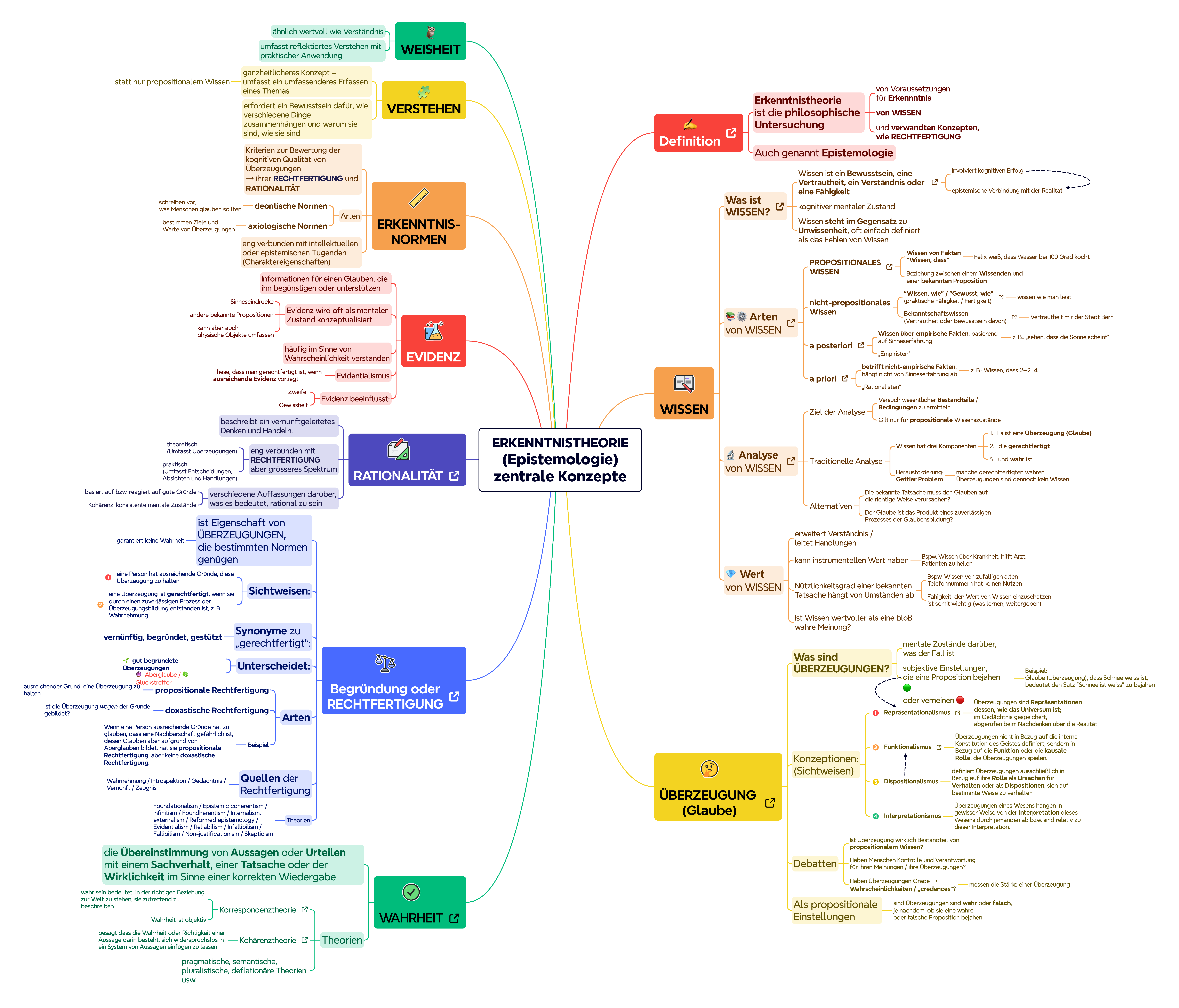 In dem folgenden Mindmap ist eine grobe Übersicht zu zentralen Konzepten der Erkenntnistheorie zu finden.